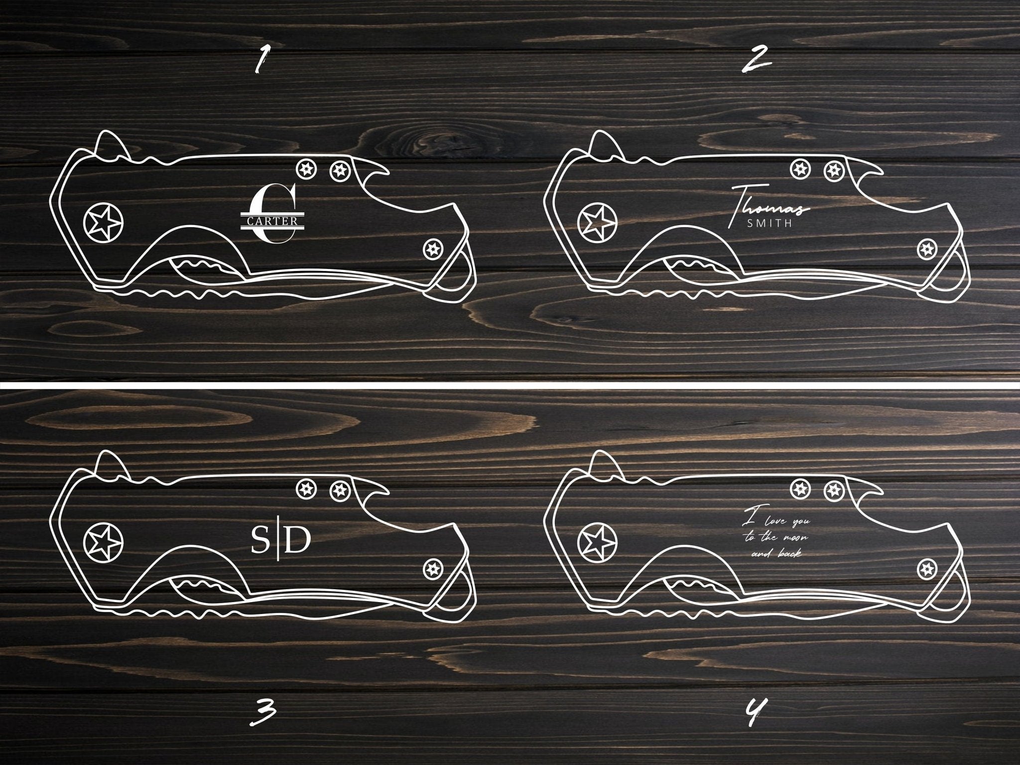 - This personalized pocket knife can be engraved with names, initials, or short text.